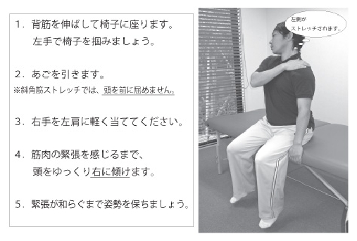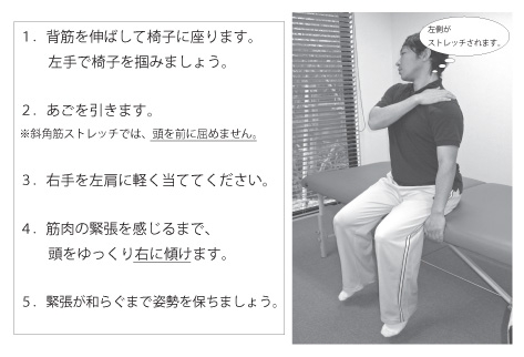 ポイントは「肩甲挙筋ストレッチ」「胸鎖乳突筋&上部僧帽筋ストレッチ」と同じように「背筋を伸ばして、あごを引く」です。